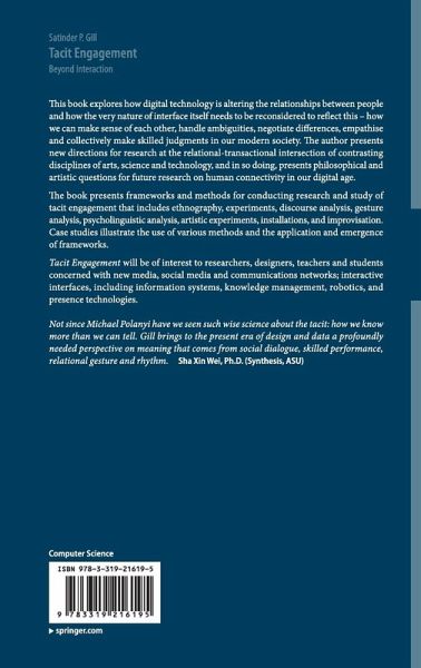 "Satinder Gill's book, Tacit Engagement: Beyond Interaction (2015 Springer) offers an insightful and important critique of tacit engagement moving beyond a mechanical model of 'interaction' as an information exchange system into one that can hold onto the fullness of dialogue-open ended, not instrumental, and spontaneous interaction. ... A highly recommended read." (Kathleen Richardson, AI & SOCIETY, November, 2016)