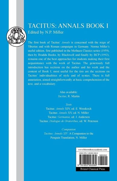 The first book of Tacitus' Annals is concerned with the reign of Tiberius and with Roman campaigns in Germany. Norma Miller's useful edition, first published in the Methuen Classics series, remains one of the best approaches for students making their first acquaintance with the work of Tacitus. The generously full introduction has sections on the author and his work and the content of Book I; most useful for the tiro are the sections on Tacitus' individualities of style and of syntax. There is full annotation, aimed straightforwardly at basic comprehension of the text, and a vocabulary.
