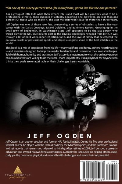 "I'm one of the ninety-percent who, for a brief time, got to live like the one percent." Ask a group of little kids what their dream job is and most will tell you they want to be a professional athlete. Their chances of actually becoming one, however, are less than one percent. Of those who do make it, the vast majority won't last for more than three years. Jeff Ogden was one of those rare few, overcoming a series of obstacles to have a five-year career with the Dallas Cowboys, Miami Dolphins, and Baltimore Ravens. Growing up in the small-town of Snohomish, in Washington State, Jeff appeared to be the last person who would play in the NFL, due in large part to the physical challenges he faced from birth. It was through a lot of hard work, inner reflection, faith, and the love of family that he entered the exclusive world of professional sports and played alongside some of the best athletes in the world. This book is a mix of anecdotes from his life-many uplifting and funny, others heartbreaking-and exercises designed to help the reader to identify and overcome their own challenges. Told with humor, humility and gratitude, Jeff's story is a testament to what the ordinary person can do when they are willing to do the work. More importantly, it is a playbook for anyone who thinks their goals are unattainable or their challenges insurmountable.