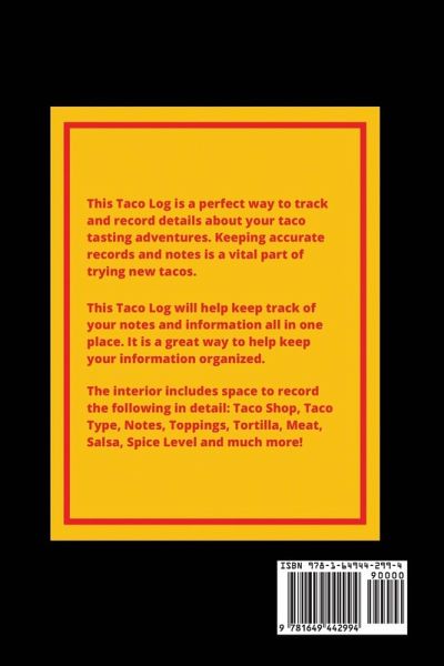 This beautiful Taco Log book is a perfect way to keep track, record and review all the tacos you have tasted. Each interior page features prompts and space to write the following: Date Taco Shop Location Taco Type Cost Notes Cuisine Toppings Tortilla Meat Salsa Type Spice Level Service Would You Go Back? Overall Rating Also makes a great gift for that special taco lover in your life! Simple and easy to use. Size is 6x9 inches, 100 pages, soft matte finish cover, white paper, black ink, paperback.