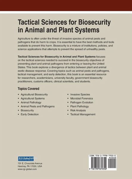 Agriculture is often under the threat of invasive species of animal pests and pathogens that do harm to crops. It is essential to have the best methods and tools available to prevent this harm. Biosecurity is a mixture of institutions, policies, and science applications that attempts to prevent the spread of unhealthy pests. Tactical Sciences for Biosecurity in Animal and Plant Systems focuses on the tactical sciences needed to succeed in the biosecurity objectives of preventing plant and animal pathogens from entering or leaving the United States. This book explores a divergence of tactics between plant and animal exotic disease response. Covering topics such as animal pests and pathogens, tactical management, and early detection, this book is an essential resource for researchers, academicians, university faculty, government biosecurity practitioners, customs officers, clinical scientists, and students.
