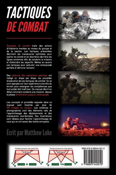 Tactiques de combat traite des actions d'infanterie menées au niveau du groupe et de la section. Les tactiques présentées décrivent les man¿uvres optimales pour opérer en sûreté et en discrétion derrière les lignes ennemies afin de conduire la mission et d'atteindre les objectifs. Mettez en ¿uvre ces tactiques pour exécuter une embuscade parfaite et détruire l'ennemi. Des vétérans des opérations spéciales ont rédigé ici, étape par étape, les procédés d'exécution de ces tactiques de combat. Ils se sont appuyés sur leur expérience concrète du terrain pour enseigner les compétences que tout soldat doit maîtriser. Ce manuel décrit en détail comment conduire une mission, depuis la phase d'infiltration jusqu'à l'embuscade. Les concepts et procédés exposés dans ce manuel sont illustrés par plus de 170 images en couleur. Les schémas et photographies sont des éléments clés de l'apprentissage des déplacements et des man¿uvres coordonnées. Ces illustrations sont idéales pour faciliter l'apprentissage de ceux qui en ont assez des textes ennuyeux.