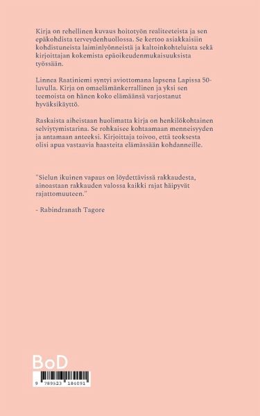Kirja on rehellinen kuvaus hoitotyön realiteeteista ja sen epäkohdista terveydenhuollossa. Se kertoo asiakkaisiin kohdistuneista laiminlyönneistä ja kaltoinkohteluista sekä kirjoittajan kokemista epäoikeudenmukaisuuksista työssään. Linnea Raatiniemi syntyi aviottomana lapsena Lapissa 50-luvulla. Kirja on omaelämänkerrallinen ja yksi sen teemoista on hänen koko elämäänsä varjostanut hyväksikäyttö. Raskaista aiheistaan huolimatta kirja on henkilökohtainen selviytymistarina. Se rohkaisee kohtaamaan menneisyyden ja antamaan anteeksi. Kirjoittaja toivoo, että teoksesta olisi apua vastaavia haasteita elämässään kohdanneille. "Sielun ikuinen vapaus on löydettävissä rakkaudesta, ainoastaan rakkauden valossa kaikki rajat häipyvät rajattomuuteen." - Rabindranath Tagore