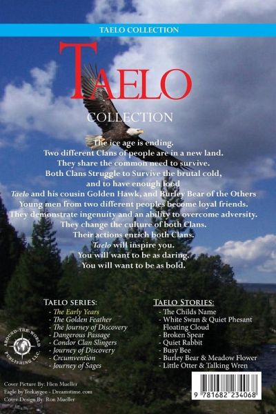 Taelo Collection The Early Years The Golden Feather The Journey of Discovery Dangerous Passage Condor Clan Slingers Circumvention Journey of Sages The Early Years begins with his naming and takes the reader through Taelo's and Golden Hawk's early years into young adulthood. They constantly contribute to the well-being of all around them. They are known throughout all the Elk sub clans as being good luck to have around. In The Golden Feather this same team takes the next step in their development. They first travel South into the Andes of South America. They meet the people living in those areas. On their return they go into the North Coastal area where the Elk Clan originally had its home. In The Journey of Discovery Taelo and Golden Hawk travel from the Pacific to the Atlantic Ocean and see the wonders of nature. In Dangerous Passage the team travels across the northern ice bridge to the origin of their race. They meet and befriend a clan of their heritage and bring a group back with them. In Condor Clan Slingers the team returns to aid the Condor Clan in their battle against an aggressive Warrior Clan. In Circumvention Taelo pushes beyond the boundaries and discovers that the world is like a round boulder. It is rough and pitted but by moving in one direction you return to were you started. In the Journey of Sages, Taelo guides the Sages of his clan on trip around the Pacific. They meet people on the far side.