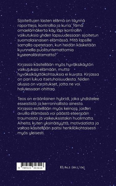 Sijoitettujen lasten elämä on täynnä raportteja, kontrollia ja kuria. Tämä omaelämäkerta käy läpi kontrollin vaikutuksia yhden lapsuudessaan sijoitetun suomalaisnaisen elämässä. Mitä lapsille samalla opetetaan, kun heidän käsketään kuunnella puolituntemattomia kyseenalaistamatta? Kirjassa käsitellään myös hyväksikäytön vaikutuksia elämään, mutta hyväksikäyttökohtauksia ei kuvata. Kirjassa on pari lukua itsetuhoisuudesta. Niiden alussa on varoitukset, jotta ne voi halutessaan ohittaa. Teos on eräänlainen hybridi, joka yhdistelee esseististä ja kerronnallista ainesta. Kirjassa esitellään myös keinoja, joiden avuilla elämässä voi päästä eteenpäin traumoista ja vaikeuksistakin huolimatta. Aiheita, kuten yksinäisyyttä, motivaatiota ja valtaa käsitellään paitsi henkilökohtaisesti myös yleisesti.