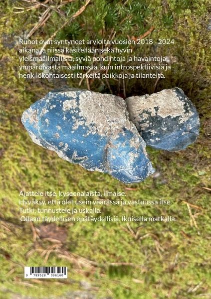 Runot ovat syntyneet arviolta vuosien 2018 - 2024 aikana ja niissä käsitellään sekä hyvin yleismaailmallisia, syviä pohdintoja ja havaintoja ympäröivästä maailmasta, kuin introspektiivisiä ja henkilökohtaisesti tärkeitä paikkoja ja tilanteita. Ajattele itse, kyseenalaista, ilmaise. Hyväksy, että olet usein väärässä ja vastuussa itse. Tutki, tunnustele ja uskalla. Ollaan täydellisen epätäydellisiä. Ikuisella matkalla.