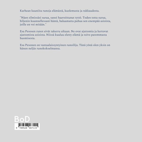 Karhean kauniita runoja elämästä, kuolemasta ja rakkaudesta. "Näen silmissäsi surua, sanoi haavoittunut tyttö. Toden totta surua, hiljenin kuunnellessani häntä, haluamatta puhua sen enempää asioista, joille en voi mitään." Esa Pesosen runot eivät takerru aikaan. Ne ovat ajattomia ja kertovat ajattomista asioista. Niissä kuuluu eletty elämä ja toivo paremmasta huomisesta.