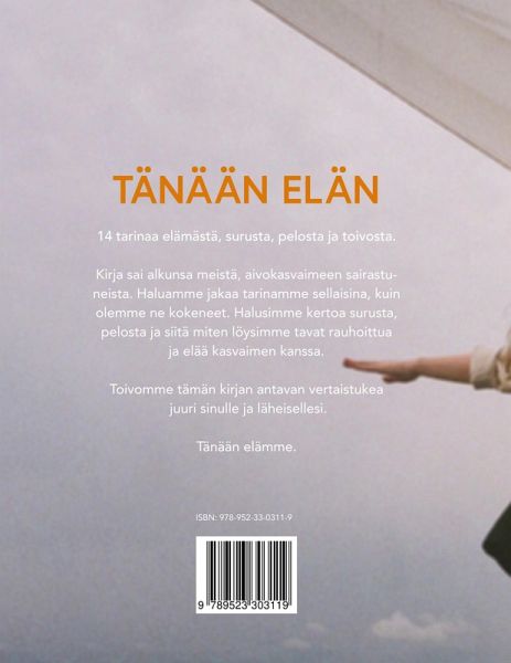 Kannattelevia tositarinoita elämästä aivokasvaimen kanssa ja elämän merkityksellisyydestä. Kuvittele, että sinä tai läheisesi sairastuisi vakavasti. Miten löydät voimaa, iloa ja merkityksellisyyttä elämääsi? Miten rakennat elämää vakavan sairauden kanssa? Tänään elän on kokoelma tositarinoita elämästä aivokasvaimen kanssa. Tarinat kertovat elämästä sairauden kanssa elävien näkökulmasta. Vaikka sairaus tuo mukanaan monenlaisia menetyksiä, tarinat heijastavat voimaa ja iloa. Tänään elän.