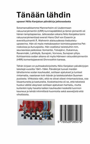 Sotamarsalkkamme Mannerheim oli Uudenmaan rakuunarykmentin (URR) kunniapäällikkö ja tämä rykmentti oli hänen lempilapsensa. Jatkosodan aikana Niilo Kenjakka toimi rakuunarykmentissä eversti Hans Olof von Essenin ja everstiluutnantti Å. Wahrenin alaisuudessa tiedustelu-upseerina. Hän oli myös metsäosaston toimistoupseerina Petroskoissa ja Aunusjoella. Hän osallistui taisteluihin mm. seuraavissa paikoissa: Ilomantsi, Tolvajärvi, Oukannus, Ravanmäki, Lahtikylä, Sunajoki, Vornova, Sunajoen ylitys. Kohtaamisia sodan aikana oli myös Hämeen ratsuväkirykmentin (HRR) komentajaeversti Ehrnroothin kanssa. Tähän kirjaan on puhtaaksikirjoitettu Niilo Kenjakan päiväkirjojen tekstejä vuosilta 1941-1944. Päiväkirjat tuovat meidän lähellemme sodan kauheudet, sotilaan ajatukset ja tunteet rintamalta, raastavan koti-ikävän ja taistelutahdon Suomen puolesta. Vihkoista näki, että ne olivat olleet rintamaolosuhteissa, osa likaantuneita ja kastuneita. Koskettavinta oli se, että tekstistä huokui välillä väsyneen sotilaan ajatuksen harhailu, mutta kuitenkin kyky havaita kaiken kauheuden keskellä luonnon kauneus ja tehdä inhimillisiä huomioita sekä aseveljistä että vihollisista.