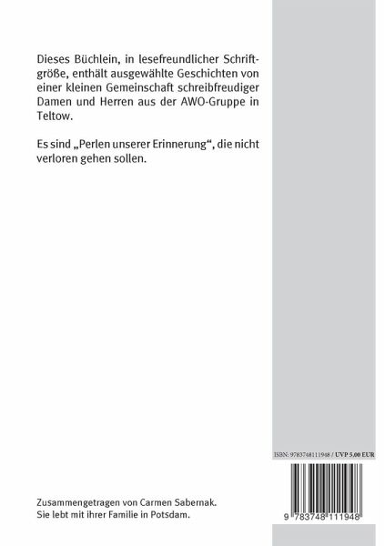 Dieses Büchlein, in lesefreundlicher Schriftgröße, enthält ausgewählte Geschichten und Gedichte von einer kleinen Gemeinschaft schreibfreudiger Damen aus der AWO-Gruppe in Teltow und Gastbeiträgen.Es sind "Perlen unserer Erinnerung", die nicht verloren gehen sollen.