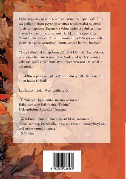 Entinen poliisi, nykyinen vanhan tavaran kauppias Valo Kurki saa perhetutultaan pyynnön selvittää tapaturmaksi tulkittua kuolemantapausta. Tapaus vie Valon oudoille poluille: onko kyseessä sarjamurhaaja, vai onko kaikki vain sattumaa ja Valon mielikuvitusta? Apua tutkimuksiinsa Valo saa vanhoilta ystäviltään ja verkostoiltaan, mutta keneen hän voi luottaa? Yksityiselämässäkin tapahtuu yllättäviä käänteitä, kun Valo saa postia toiselta puolen maailmaa. Synkeä syksy ehtii kääntyä pakkastalveksi, ennen kuin arvoitukset ratkeavat - tai ainakin osa niistä. Täydellinen päivä on jatkoa West Endin tytöille. Sarja sijoittuu 1990-luvun Helsinkiin. Lukijasuosituksia (West Endin tytöt): "Tiivistetysti: hyvä tarina, mainio kerronta. Esikoisdekkari? Esikoiskirja? Tuskin." (Dekkarihelmenkalastaja, Instagram) "West Endin tytöt on ilmava kesädekkari, mainiota lomalukemista. Päähenkilökin sai siinä määrin taustayhteyksiä, että jatkoa varmasti seuraa." (TS, Twitter)
