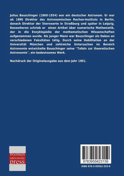 Julius Bauschinger (1860-1934) war ein deutscher Astronom. Er war ab 1896 Direktor des Astronomischen Rechen-Instituts in Berlin, danach Direktor der Sternwarte in Straßburg und später in Leipzig. Desweiteren schrieb er einen Artikel über numerische Mathematik, der in die Enzyklopädie der mathematischen Wissenschaften aufgenommen wurde. Als junger Mann war Bauschinger als Dekan an verschiedenen Fakultäten tätig. Durch seine Habilitation an der Universität München und zahlreiche Untersuchen im Bereich Astronomie entwickelte Bauschinger seine \'\'Tafeln zur theoretischen Astronomie\'\', ein bedeutsames Werk.