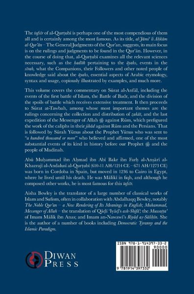 The tafs¿r of al-Qur¿ub¿ is perhaps one of the most compendious of them all and is certainly among the most famous. As its title, al-J¿mi' li A¿k¿m al-Qur'¿n - The General Judgments of the Qur'an, suggests, its main focus is on the rulings and judgments to be found in the Qur'¿n. However, in the course of doing that, al-Qur¿ub¿ examines all the relevant sciences necessary, such as the ¿ad¿th pertaining to the ¿yahs, events in the s¿rah, what the Companions, their Followers and other noted people of knowledge said about the ¿yahs, essential aspects of Arabic etymology, syntax and usage, copiously illustrated by examples, and much more. This volume covers the commentary on S¿rat al-Anf¿l, including the events of the first battle of Islam, the Battle of Badr, and the division of the spoils of battle which receives extensive treatment. It then proceeds to S¿rat at-Tawbah, among whose most important themes are the rulings concerning the collection and distribution of zak¿t, and the last expedition of the Messenger of Allah, peace be upon him, against R¿m, which prefigured the work of the caliphs in their jih¿d against R¿m and the Persians. That is followed by S¿rah Y¿nus about the Prophet Y¿nus who was sent to "a hundred thousand or more" who believed and affirmed, one of the most substantial events of its kind in history before our Prophet, may Allah bless him and grant him peace, and the people of Madinah.
