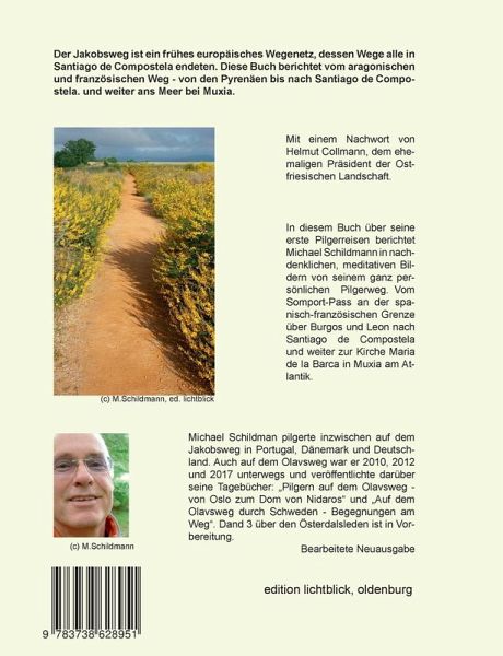 In meditativen Bildern erleben Sie den Jakobsweg mit den Augen des Fotografen Michael Schildmann. Vom Somport-Pass an der spanisch-französischen Grenze über Burgos und Leon bis nach Santiago de Compostela. Er startete allein, traf auf seinem Weg Menschen, die ihm wichtig wurden und ging doch auch seinen weiteren Weg allein. Über Santiago de Compostela hinaus pilgerte er drei weitere Tage lang bis in das traumhafte Muxia mit seiner Kirche Santa Maria de la Barca am Atlantik und verzichtete dafür auf den Abschluss in Fisterre. Auch die letzten 25 km bis zu seinem Heimatort pilgerte er nach einer 2-tägigen Rückfahrt zu Fuß. Die Ausgabe 2015 wurde komplett überarbeitet und enthält weiterhin drei Predigttexte zum Thema " Aufbrechen / Entschleunigen / Ankommen " aus der Ausstellungszeit in der Forumskirche St. Peter im September/Oktober 2010 in Oldenburg und durch Texte aus der Verwendung als Adventskalender im Pius-Hospital Oldenburg.