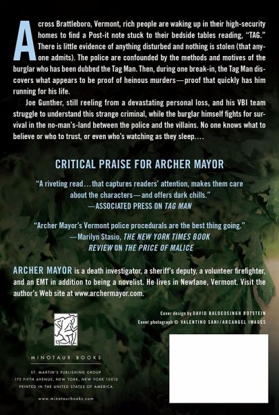"Archer Mayor's Vermont police procedurals are the best thing going..." -New York Times Book Review Across Brattleboro, Vermont, rich people (some with dark secrets) are waking up in their high security, alarm-equipped homes to find a Post-it note stuck to their bedside tables reading, "You're it." There is little sign of disturbance anywhere, nothing stolen (that anyone admits,) and only a bit of expensive food eaten as a signature. The Press loves the story and dubs the burglar the Tag Man. But who is he? And what's he actually doing? In fact, he's quickly running for his life, for what he discovers in one of these houses appears to be proof of a heinous string of murders. But is it? Joe Gunther, struggling to recover from a devastating personal loss, leads his VBI team to untangle the many conflicting pieces of evidence, while the burglar himself struggles for survival in the no-man's-land between the police and the villains. With no one knowing what to believe, or who to trust, with Tag Man running for his life in a way he never imagined possible, as no one knows who's watching as they sleep, or who truly did what, the Tag Man is critically acclaimed author Archer Mayor at his very finest.