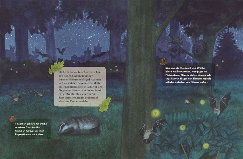 Wir haben es hier schon fast mit einem poetischen Sachbuch zu tun, so sanft und einfühlsam kommt es daher. Wir spüren geradezu die Ruhe des Waldes. Ein bisschen so, als würden wir auf dieser Lichtung stehen und alles beobachten. Die Autorin ist Biologin und schafft es, das Wissen über Pflanzen und Tiere so zu verpacken, dass kleine und große Kinder (inkl. mir) staunen, ohne überfordert zu werden.
