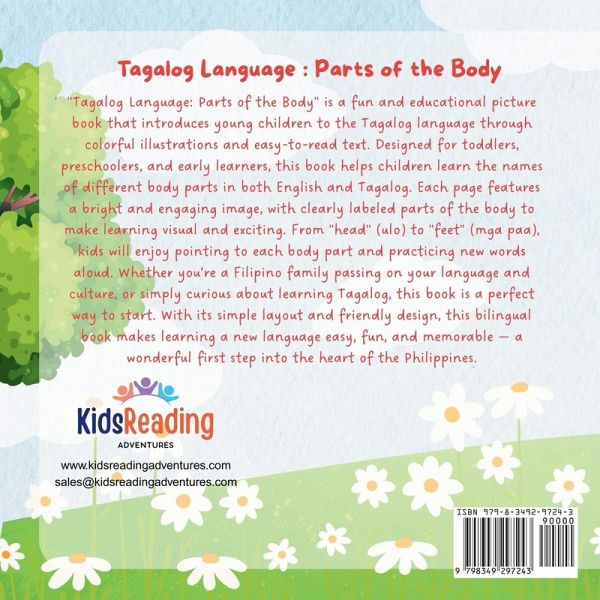 Tagalog Language: Parts of the Body is a fun and educational picture book that introduces young children to the Tagalog language through colorful illustrations and easy-to-read text. Designed for toddlers, preschoolers, and early learners, this book helps children learn the names of different body parts in both English and Tagalog. Each page features a bright and engaging image, with clearly labeled parts of the body to make learning visual and exciting. From "head" (ulo) to "feet" (mga paa), kids will enjoy pointing to each body part and practicing new words aloud. Whether you're a Filipino family passing on your language and culture, or simply curious about learning Tagalog, this book is a perfect way to start. With its simple layout and friendly design, this bilingual book makes learning a new language easy, fun, and memorable - a wonderful first step into the heart of the Philippines.