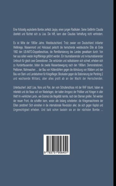 Eine frühzeitig explodierte Bombe zerfetzt einen jungen Linksradikalen. Seine Gefährtin Claudia überlebt und flüchtet sich zu Lisa. Die hilft, kann aber Claudias Verhaftung nicht verhindern.Es ist Mitte der 1980er Jahre. Westdeutschland. Trotz zweier von Deutschland initiierter Weltkriege, Massenmord und Holocaust peitscht die herrschende westdeutsche Elite ab Ende 1982 den US-NATO-Doppelbeschluss, die Remilitarisierung des Landes gewaltsam durch: Von hier aus sollen wieder Angriffskriege geführt werden. Ein traumatisierender und re-traumatisierender Umbruch für gleich zwei Generationen. Die verbünden und radikalisieren sich schnell, erheben sich zu Hunderttausenden, bilden die zweite Massenbewegung nach den 1968ern. Demonstrationen, Petitionen, Mahnwachen, der Bau von Hüttendörfern gegen die Abholzung von Wäldern und den Bau von Start- und Landebahnen für Kriegsflieger, Blockaden gegen die Stationierung der Pershing 2 und wachsende Militanz, aber alles prallt ab an der Macht derHerrschenden.Untertauchen! Jetzt! Lisa, Nora und Pan, der vom Schulterschluss mit der RAF träumt, haben die Nase voll von Niederlagen, der kalten Arroganz der Politiker und Kriegen in aller Welt! Im »wirklichen Land«, wie Gramsci die Illegalität nannte, nach den Sternen greifen, Teil werden der neuen Front, die schaffen kann, woran alle bislang scheiterten: die Kriegsmaschinerie der Eliten zerstören! Sich einreihen in die internationale Revolution aller, die sich gegen Kapital und Ungerechtigkeit erheben. Und bald schon basteln sie an einer Bombe ...