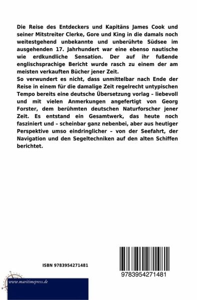 Die Reise des Entdeckers und Kapitäns James Cook und seiner Mitstreiter Clerke, Gore und King in die damals noch weitestgehend unbekannte und unberührte Südsee im ausgehenden 17. Jahrhundert war eine ebenso nautische wie erdkundliche Sensation. Der auf ihr fußende englischsprachige Bericht wurde rasch zu einem der am meisten verkauften Bücher jener Zeit.