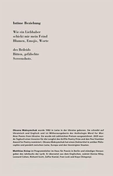 Das erschütternde poetische Dokument über den Krieg in der Ukraine - Oksana Maksymchuk, eine wichtige internationale, neue Stimme in der LyrikDie ukrainische Dichterin Oksana Maksymchuk hat vor und während der russischen Invasion ein poetisches Tagebuch verfasst - es handelt von dem schauerlichen Alltag des Krieges. Sie mischt dabei Stimmen und Bilder - Erlebtes, soziale Medien, Nachrichten, Zeugenaussagen, Fotos, Drohnenvideos: »Wie ein Liebhaber / schickt mir mein Feind / Blumen, Emojis, Worte // des Beileids / Bitten, gefälschte / Screenshots.« Selten wurde in der Poesie das Grauen des Krieges eindrücklicher dokumentiert. Maksymchuks Gedichte haben eine erschütternde Direktheit in einer Situation, die kaum Raum für Metaphern zulässt. Ihre Poesie ist das Zeugnis einer Erfahrung täglicher Zerstörung, an die wir uns allzu schnell gewöhnt haben.