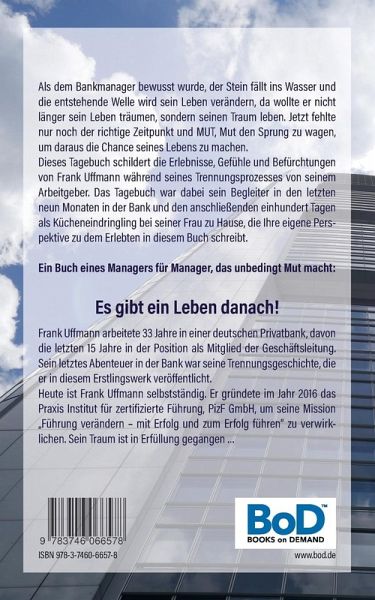 Als dem Bankmanager bewusst wurde, der Stein fällt ins Wasser und die entstehende Welle wird sein Leben verändern, da wollte er nicht länger sein Leben träumen, sondern seinen Traum leben. Jetzt fehlte nur noch der richtige Zeitpunkt und MUT, Mut den Sprung zu wagen, um daraus die Chance seines Lebens zu machen. Dieses Tagebuch schildert die Erlebnisse, Gefühle und Befürchtungen von Frank Uffmann während seines Trennungsprozesses von seinem Arbeitgeber. Das Tagebuch war dabei sein Begleiter in den letzten neun Monaten in der Bank und den anschließenden einhundert Tagen als Kücheneindringling bei seiner Frau zu Hause, die Ihre eigene Perspektive zu dem Erlebten in diesem Buch schreibt. Ein Buch eines Managers für Manager, das unbedingt Mut macht: Es gibt ein Leben danach!