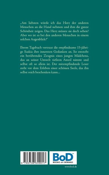 "Am liebsten würde ich das Herz der anderen Menschen an die Hand nehmen und ihm die ganze Schönheit zeigen. Das Herz müsste sie doch sehen? Aber wo ist es bei den anderen Menschen in einem solchen Augenblick?"Ihrem Tagebuch vertraut die empfindsame 15-jährige Saskia ihre innersten Gedanken an. So entsteht ein berührendes Zeugnis eines jungen Mädchens, das an seiner Umwelt tiefsten Anteil nimmt und selbst oft so allein ist. Der mitempfindende Leser steht vor dem Erleben einer schönen Seele, das ihn selbst reich beschenken kann...