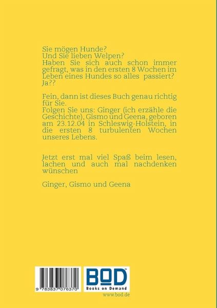 Dies ist ein Tagebuch von uns Welpen für unsere neuen Besitzer und für Tierfreunde überall auf der Welt.Es wurden schon so viele Bücher über Hundeerziehung, Pflege, Ausbildung, Hundesport und und und geschrieben, das unser Frauchen Bine und wir der Meinung waren, ein Buch über die ersten 8 Wochen im Leben eines Welpen muss her, denn auch diese sind unheimlich spannend, finden wir zumindest......Dieses Buch handelt von uns; Ginger (ich erzähle die Geschichte), Gismo und Geena, geboren am 23.12.04 in Schleswig-Holstein.Unsere stolze Mama heißt Scully (eindeutig Akte X-Fans!) und unser Papa heißt Mayloo (wo ist Mulder?).Es gibt noch eine zweite Hündin namens Lilly, die für uns drei sowas wie eine Tante ist, aber dazu später mehr.Jetzt erst mal viel Spaß beim lesen, lachen und auch mal nachdenken wünschenGinger, Gismo und Geena