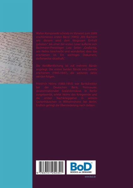 Walter Kempowski schrieb im Vorwort zum 2009 erschienenen ersten Band (1945): "Mit Büchern wie diesem wird dem Vergessen Einhalt geboten." Als einer der ersten Leser äußerte sich Bachmann-Preisträger Lutz Seiler: "Großartig, wie Helms beschreibt und wunderbar, dass das erschienen ist. Ein wichtiges Dokument, stellenweise rätselhaft."Die Veröffentlichung ist auf mehrere Bände angelegt. Die ersten beiden Bände sind bereits erschienen (1945-1947), die weiteren Jahre werden folgen.Friedrich Helms (1883-1955) war Bankdirektor bei der Deutschen Bank, Freimaurer, deutschnationaler Sozialdemokrat. In Berlin ausgebombt, erlebt Helms das Kriegsende und die ersten Nachkriegsjahre in seinem Gartenhäuschen in Wilhelmshorst bei Berlin. Endlich gelingt die Übersiedelung nach Uelzen.Tobias WimbauerGeboren am 13. Juni 1976 in Überlingen am Bodensee, aufgewachsen in St. Ulrich im Schwarzwald, bis zum ersten Studienabbruch in Freiburg und nach einem kurzen Intermezzo in Sachsen-Anhalt seit 2003 in Hagen. Verheiratet, vier Katzen (nur noch). Inhaber eines Versand-antiquariates, freier Schriftsteller und Publizist mit einigen Buch- und Zeitschriften- und Zeitungsveröffentlichungen. Lebt im Nimmertal bei Hagen im ehemaligen "Naturfreundehaus Nimmertal". Wichtigste Veröffentlichungen: Personenregister der Tagebücher Ernst Jüngers (1999,2003,2010), Lagebericht und andere Erzählungen (2008), Anarch im Widerspruch (2004,2010), Ausweitung der Bücherhöhle (2010), Hundert Dinge (2012), Haben Sie Steffi Briest? (2012), Ernst Jünger in Paris (2011), Landschaften im inneren Vorbeifahren (2016)