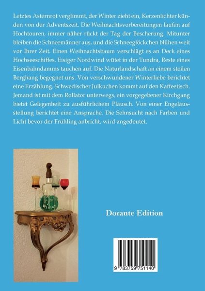 Letztes Asternrot verglimmt, der Winter zieht ein, Kerzenlichter künden von der Adventszeit. Die Weihnachtsvorbereitungen laufen auf Hochtouren, immer näher rückt der Tag der Bescherung. Mitunter bleiben die Schneemänner aus, und die Schneeglöckchen blühen weit vor Ihrer Zeit. Einen Weihnachtsbaum verschlägt es an Deck eines Hochseeschiffes. Eisiger Nordwind wütet in der Tundra, Reste eines Eisenbahndamms tauchen auf. Die Naturlandschaft an einem steilen Berghang begegnet uns. Von einer verschwundenen Winterliebe berichtet eine Erzählung. Schwedischer Julkuchen kommt auf den Kaffeetisch. Jemand ist mit dem Rollator unterwegs, ein vorgegebener Kirchgang bietet Gelegenheit zu ausführlichem Plausch. Von einer Engelausstellung berichtet eine Ansprache. Die Sehnsucht nach Farben und Licht bevor der Frühling anbricht wird angedeutet.