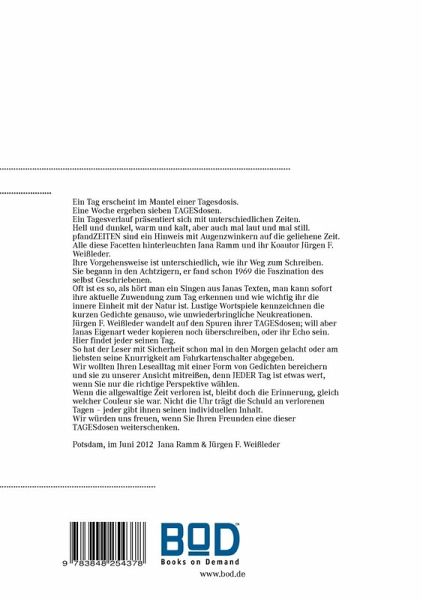 Ein Tag erscheint im Mantel einer Tagesdosis.Eine Woche ergeben sieben TAGESdosen.Ein Tagesverlauf präsentiert sich mit unterschiedlichen Zeiten. Hell und dunkel, warm und kalt, aber auch mal laut und mal still.pfandZEITEN sind ein Hinweis mit Augenzwinkern auf die geliehene Zeit.Alle diese Facetten hinterleuchten Jana Ramm und ihr Koautor Jürgen F. Weißleder.