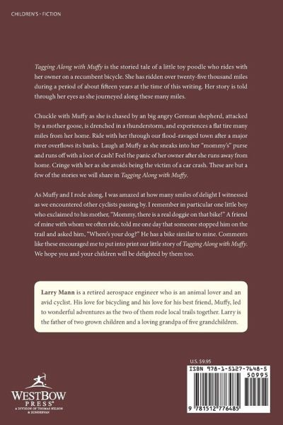 Tagging Along with Muffy is the storied tale of a little toy poodle who rides with her owner on a recumbent bicycle. She has ridden over twenty-five thousand miles during a period of about fifteen years at the time of this writing. Her story is told through her eyes as she journeyed along these many miles. Chuckle with Muffy as she is chased by an big angry German shepherd, attacked by a mother goose, is drenched in a thunderstorm, and experiences a flat tire many miles from her home. Ride with her through our flood-ravaged town after a major river overflows its banks. Laugh at Muffy as she sneaks into her "mommy’s" purse and runs off with a loot of cash! Feel the panic of her owner after she runs away from home. Cringe with her as she avoids being the victim of a car crash. These are but a few of the stories we will share in Tagging Along with Muffy. As Muffy and I rode along, I was amazed at how many smiles of delight I witnessed as we encountered other cyclists passing by. I remember in particular one little boy who exclaimed to his mother, "Mommy, there is a real doggie on that bike!" A friend of mine with whom we often ride, told me one day that someone stopped him on the trail and asked him, "Where’s your dog?" He has a bike similar to mine. Comments like these encouraged me to put into print our little story of Tagging Along with Muffy. We hope you and your children will be delighted by them too.