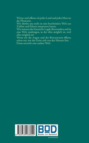 Weiter und offener als jedes Land ist unsere Phantasie.Wir dürfen uns nicht in eine beschränkte Welt aus Zahlen und Fakten einsperren lassen. Wir müssen die klassische Logik überwinden und in eine Welt eindringen, in der alles möglich ist, weil es möglich ist!Wenn wir die Augen und das Bewusstsein öffnen, sehen wir, wie der Geist sich von der Materie löst. Dann entsteht eine andere Welt. Diese Welt möchte ich beschreiben. Als dem Kopisten des Urwissens der Menschheit. Der Dichtung!