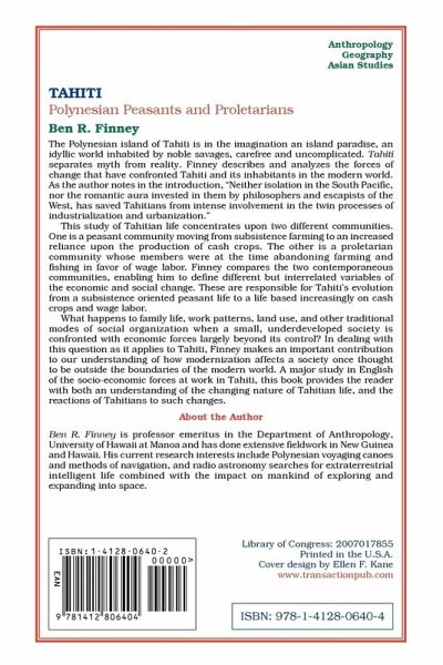 The Polynesian island of Tahiti is in the imagination an island paradise, an idyllic world inhabited by noble savages, carefree and uncomplicated. Tahiti separates myth from reality. Finney describes and analyzes the forces of change that have confronted Tahiti and its inhabitants in the modern world. As the author notes in the introduction, "Neither isolation in the South Pacific, nor the romantic aura invested in them by philosophers and escapists of the West, has saved Tahitians from intense involvement in the twin processes of industrialization and urbanization." This study of Tahitian life concentrates upon two different communities. One is a peasant community moving from subsistence farming to an increased reliance upon the production of cash crops. The other is a proletarian community whose members were at the time abandoning farming and fishing in favor of wage labor. Finney compares the two contemporaneous communities, enabling him to define different but interrelated variables of the economic and social change. These are responsible for Tahiti's evolution from a subsistence oriented peasant life to a life based increasingly on cash crops and wage labor. What happens to family life, work patterns, land use, and other traditional modes of social organization when a small, underdeveloped society is confronted with economic forces largely beyond its control? In dealing with this question as it applies to Tahiti, Finney makes an important contribution to our understanding of how modernization affects a society once thought to be outside the boundaries of the modern world. A major study in English of the socio-economic forces at work in Tahiti, this book provides the reader with both an understanding of the changing nature of Tahitian life, and the reactions of Tahitians to such changes.