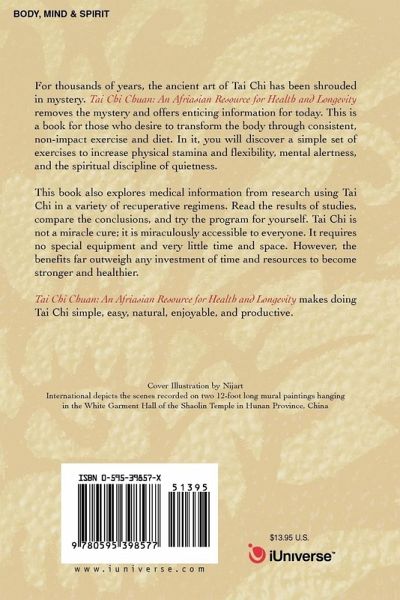 For thousands of years, the ancient art of Tai Chi has been shrouded in mystery. Tai Chi Chuan: An Afriasian Resource for Health and Longevity removes the mystery and offers enticing information for today. This is a book for those who desire to transform the body through consistent, non-impact exercise and diet. In it, you will discover a simple set of exercises to increase physical stamina and flexibility, mental alertness, and the spiritual discipline of quietness. This book also explores medical information from research using Tai Chi in a variety of recuperative regimens. Read the results of studies, compare the conclusions, and try the program for yourself. Tai Chi is not a miracle cure; it is miraculously accessible to everyone. It requires no special equipment and very little time and space. However, the benefits far outweigh any investment of time and resources to become stronger and healthier. Tai Chi Chuan: An Afriasian Resource for Health and Longevity makes doing Tai Chi simple, easy, natural, enjoyable, and productive.