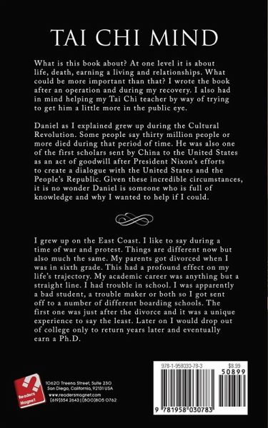 hat is this book about? At one level it is about life, death, earning a living and relationships. What could be more important than that? I wrote the book after an operation and during my recovery. I also had in mind helping my Tai Chi teacher by way of trying to get him a little more in the public eye. Daniel as I explained grew up during the Cultural Revolution. Some people say thirty million people or more died during that period of time. He was also one of the first scholars sent by China to the United States as an act of goodwill after the then President Nixon's efforts to create a dialogue the United States the People's Republic. Given these incredible circumstances, it is no wonder Daniel is someone who is full of knowledge and why I wanted help if I could.