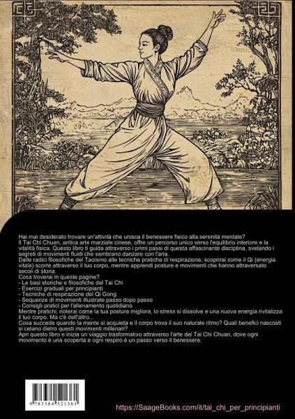 Benvenuti nel mondo del Tai Chi Chuan, l'antica arte marziale cinese che unisce movimento, respirazione e meditazione. Questo libro tai chi offre una guida completa per chi si avvicina per la prima volta a questa disciplina millenaria.Il manuale è strutturato in modo progressivo, partendo dalle basi fondamentali dell'arte marziale interna fino alle tecniche più avanzate. La prima sezione esplora la ricca storia e filosofia del tai chi, le sue origini e l'evoluzione nel tempo, permettendo ai lettori di comprendere il contesto culturale di questa pratica.Nella sezione dedicata ai principianti, il libro di tai chi si concentra sugli elementi essenziali: la corretta postura, la respirazione consapevole e i movimenti di base. Vengono presentati esercizi preparatori e tecniche di riscaldamento specifiche per iniziare la pratica in sicurezza.Una parte significativa è dedicata al tai chi qi gong, con esercizi specifici per la circolazione dell'energia vitale e il rafforzamento del corpo.Gli studenti impareranno a coordinare respiro e movimento, sviluppando gradualmente consapevolezza corporea e equilibrio.Il testo include dettagliate descrizioni delle posizioni fondamentali del tai chi chuan, accompagnate da spiegazioni sulla corretta esecuzione dei movimenti. Particolare attenzione viene data alle sequenze base e alle loro applicazioni pratiche.Vengono inoltre approfonditi gli aspetti legati al benessere psicofisico: come il taichi può migliorare la postura, ridurre lo stress, aumentare la flessibilità e potenziare l'equilibrio. La sezione finale esplora gli elementi più avanzati dell'arte marziale cinese, offrendo spunti per il progresso continuo nella pratica.Questo tai chi per principianti rappresenta uno strumento prezioso per iniziare il proprio percorso nell'arte marziale interna, combinando teoria e pratica in un approccio graduale e accessibile.Questo libro è stato creato utilizzando tecnologie innovative come l'Intelligenza Artificiale e strumenti sviluppati appositamente - ad esempio, nella ricerca di idee, nella ricerca, nella scrittura, nella redazione, nel controllo qualità e nella progettazione di illustrazioni decorative.In questo modo, vogliamo offrirvi un'esperienza di lettura particolarmente coerente, moderna e di qualità ancora superiore.