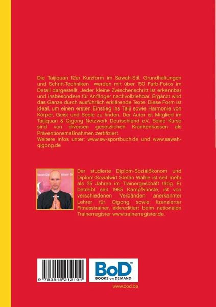 Die Taijiquan 12er Kurzform im Sawah-Stil, Grundhaltungen und Schritt-Techniken werden mit über 150 Farb-Fotos im Detail dargestellt. Jeder kleine Zwischenschritt ist erkennbar und insbesondere für Anfänger nachvollziehbar. Ergänzt wird das Ganze durch ausführlich erklärende Texte. Diese Form ist ideal, um einen ersten Einstieg ins Taiji sowie Harmonie von Körper, Geist und Seele zu finden.Weitere Infos unter: www.sw-sportbuch.de und www.sawah-qigong.deDer studierte Diplom-Sozialökonom und Diplom-Sozialwirt Stefan Wahle ist seit 30 Jahren im Trainergeschäft tätig. Er betreibt seit 1985 Kampfkünste, ist Lehrer für Qigong (BVTQ und DDQT) sowie lizenzierter Fitnesstrainer.Stefan Wahle hat bereits diverse Sportratgeber veröffentlicht und ist Mitglied in der Bundesvereinigung für Taijiquan und Qigong e.V.. Seine Qigong-Kurse sind von den gesetzlichen Krankenkassen im Rahmen der Prävention anerkannt.