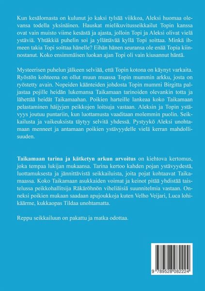 Kun kesälomasta on kulunut jo kaksi tylsää viikkoa, Aleksi huomaa olevansa todella yksinäinen. Hauskat mielikuvitusseikkailut Topin kanssa ovat vain muisto viime kesästä ja ajasta, jolloin Topi ja Aleksi olivat vielä ystäviä. Yhtäkkiä puhelin soi ja yllättävää kyllä Topi soittaa. Minkä ihmeen takia Topi soittaa hänelle? Eihän hänen seuransa ole enää Topia kiinnostanut. Koko ensimmäisen luokan ajan Topi oli vain kiusannut häntä. Mysteerisen puhelun jälkeen selviää, että Topin kotona on käynyt varkaita. Ryöstön kohteena on ollut muun muassa Topin mummin arkku, josta on ryöstetty avain. Nopeiden käänteiden johdosta Topin mummi Birgitta paljastaa pojille heidän lukemansa Taikamaan tarinoiden olevankin totta ja lähettää heidät Taikamaahan. Poikien harteille lankeaa koko Taikamaan pelastaminen häijyjen peikkojen loitsuja vastaan. Aleksin ja Topin ystävyys joutuu puntariin, kun luottamusta vaaditaan molemmin puolin. Seikkailusta ja vaikeuksista täytyy selvitä yhdessä. Pystyykö Aleksi unohtamaan menneet ja antamaan poikien ystävyydelle vielä kerran mahdollisuuden. Taikamaan tarina ja kätketyn arkun arvoitus on kiehtova kertomus, joka tempaa lukijan mukaansa. Tarina kertoo kahden pojan ystävyydestä, luottamuksesta ja jännittävistä seikkailuista, joita pojat kohtaavat Taikamaassa. Koko Taikamaan asukkaiden voimat ja keinot pitää yhdistää taistelussa peikkohallitsijan Räkäröhnön viheliäisiä suunnitelmia vastaan. Onneksi poikien mukaan saadaan apujoukkoja kuten Velho Veijari, Luca lohikäärme, kukkaopas Tildaa unohtamatta. Reppu seikkailuun on pakattu ja matka odottaa.