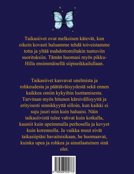 Taikasiivet ovat melkoisen kätevät, kun oikein kovasti haluamme tehdä toiveistamme totta ja yltää mahdottomiltakin tuntuviin suorituksiin. Tämän huomasi myös pikku-Hilla ensimmäisellä siipiseikkailullaan. Taikasiivet kasvavat unelmista ja rohkeudesta ja päättäväisyydestä sekä ennen kaikkea omiin kykyihin luottamisesta. Tarvitaan myös hitunen kärsivällisyyttä ja erityisesti sinnikkyyttä silloin, kun kaikki ei suju juuri niin kuin haluaisi. Näin taikasiivistä tulee vahvat kuin kotkalla, kauniit kuin upeimmalla perhosella ja kevyet kuin korennolla. Ja vaikka muut eivät taikasiipiäsi havaitsisikaan, he huomaisivat, kuinka upea ja rohkea ja ainutlaatuinen sinä olet.