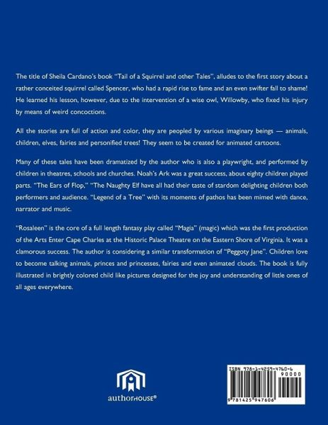 The title of Sheila Cardano's book "Tail of a Squirrel and other Tales", alludes to the first story about a rather conceited squirrel called Spencer, who had a rapid rise to fame and an even swifter fall to shame! He learned his lesson, however, due to the intervention of a wise owl, Willowby, who fixed his injury by means of weird concoctions. All the stories are full of action and color, they are peopled by various imaginary beings - animals, children, elves, fairies and personified trees! They seem to be created for animated cartoons. Many of these tales have been dramatized by the author who is also a playwright, and performed by children in theatres, schools and churches. Noah's Ark was a great success, about eighty children played parts. "The Ears of Flop," "The Naughty Elf have all had their taste of stardom delighting children both performers and audience. "Legend of a Tree" with its moments of pathos has been mimed with dance, narrator and music. "Rosaleen" is the core of a full length fantasy play called "Magia" (magic) which was the first production of the Arts Enter Cape Charles at the Historic Palace Theatre on the Eastern Shore of Virginia. It was a clamorous success. The author is considering a similar transformation of "Peggoty Jane". Children love to become talking animals, princes and princesses, fairies and even animated clouds. The book is fully illustrated in brightly colored child like pictures designed for the joy and understanding of little ones of all ages everywhere.