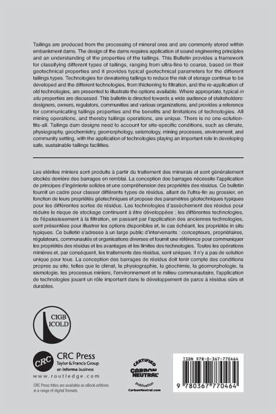 A framework for classifying different types of tailings, ranging from ultra-fine to coarse, based on their geotechnical properties and provides typical geotechnical parameters for the different tailings types. Technologies for dewatering tailings to reduce the risk of storage continue to be developed and the different technologies.