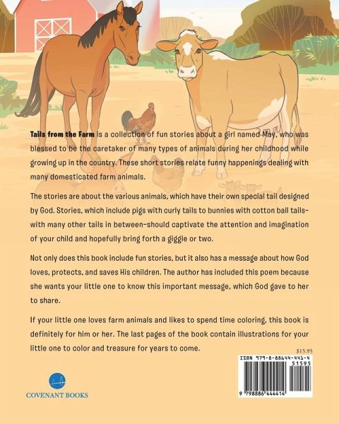 Tails from the Farm is a collection of fun stories about a girl named May, who was blessed to be the caretaker of many types of animals during her childhood while growing up in the country. These short stories relate funny happenings dealing with many domesticated farm animals. The stories are about the various animals, which have their own special tail designed by God. Stories, which include pigs with curly tails to bunnies with cotton ball tails--with many other tails in between--should captivate the attention and imagination of your child and hopefully bring forth a giggle or two. Not only does this book include fun stories, but it also has a message about how God loves, protects, and saves His children. The author has included this poem because she wants your little one to know this important message, which God gave to her to share. If your little one loves farm animals and likes to spend time coloring, this book is definitely for him or her. The last pages of the book contain illustrations for your little one to color and treasure for years to come.