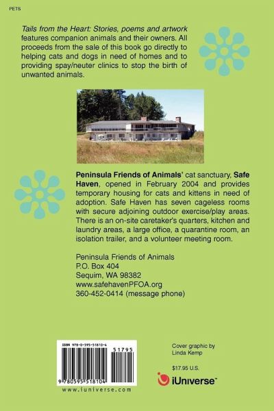 Tails from the Heart: Stories, poems and artwork features companion animals and their owners. All proceeds from the sale of this book go directly to helping cats and dogs in need of homes and to providing spay/neuter clinics to stop the birth of unwanted animals.