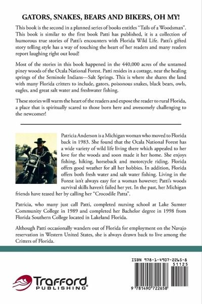 GATORS, SNAKES, BEARS AND BIKERS, OH MY! This book is the second in a planned series of books entitles "Tails of a Woodsman". This book is similar to the first book Patti has published, it is a collection of humorous true stories of Patti's encounters with Florida Wild Life. Patti's gifted story telling style has a way of touching the heart of her readers and many readers report laughing right out loud! Most of the stories in this book happened in the 440,000 acres of the untamed piney woods of the Ocala National Forest. Patti resides in a cottage, near the healing springs of the Seminole Indians---Salt Springs. This is where she shares the land with many Florida critters to include, gators, poisonous snakes, black bears, owls, eagles, and great salt water and freshwater fishing. These stories will warm the heart of the readers and expose the reader to rural Florida, a place that is spiritually scared to those born here and awesomely challenging to the newcomer!