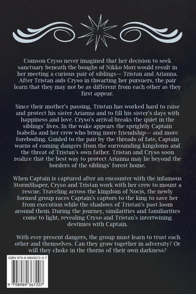 Comson Cryso never imagined that her decision to seek sanctuary beneath the boughs of Nikko Mori would result in her meeting a curious pair of siblings- Tristan and Arianna. After Tristan aids Cryso in thwarting her pursuers, the pair learn that they may not be as different from each other as they first appear. Since their mother's passing, Tristan has worked hard to raise and protect his sister Arianna and to fill his sister's days with happiness and love. Cryso's arrival breaks the quiet in the siblings' lives. In the wake appears the sprightly Captain Isabella and her crew who bring more friendship- and more foreboding. Guided to the pair by the threads of fate, Captain warns of coming dangers from the surrounding kingdoms and the threat of Tristan's own father. Tristan and Cryso soon realize that the best way to protect Arianna may lie beyond the borders of the siblings' forest home. When Captain is captured after an encounter with the infamous StormShaper, Cryso and Tristan work with her crew to mount a rescue. Traveling across the kingdom of Nocis, the newly formed group races Captain's captors to the king to save her from execution while the shadows of Tristan's past loom around them. During the journey, similarities and familiarities come to light, revealing Cryso and Tristan's intertwining destinies with Captain. With ever-present dangers, the group must learn to trust each other and themselves. Can they grow together in adversity? Or will they choke in the thorns of their own darkness?