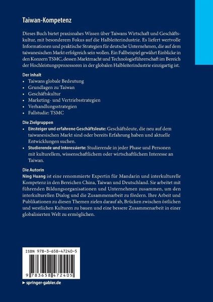 Dieses Buch bietet praxisnahes Wissen über Taiwans Wirtschaft und Geschäftskultur, mit besonderem Fokus auf die Halbleiterindustrie. Es liefert wertvolle Informationen und praktische Strategien für deutsche Unternehmen, die auf dem taiwanesischen Markt erfolgreich sein wollen. Ein Fallbeispiel gewährt Einblicke in den Konzern TSMC, dessen Marktmacht und Technologieführerschaft im Bereich der Hochleistungsprozessoren in der globalen Halbleiterindustrie einzigartig ist.
