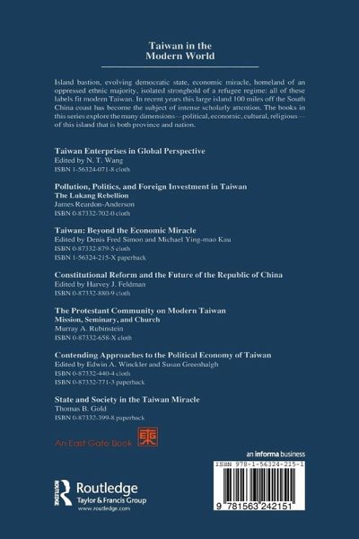 I: Political Reform and Development on Taiwan 1: Taiwan's Evolution Toward Democracy: A Historical Perspective 2: The Changing Nature of Taiwan's Politics 3: Local Politics on Taiwan: Continuity and Change 4: Classification, Power, and Markets: Waning of the Ethnic Division of Labor II: Taiwan's Changing Political Economy 5: Taiwan's Emerging Position in the International Division of Labor 6: Taiwan's Emerging Technological Trajectory: Creating New Forms of Competitive Advantage III: Social and Environmental Issues on Taiwan 7: The Labor Movement in Taiwan: A Retrospective and Prospective Look 8: Small Fortunes: Class and Society in Taiwan 9: Environmentalism in Taiwan 10: Taiwan's Rural Populace: Brought In or Left Out of the Economic Miracle? IV: Taiwan's External Relations 11: The ROC's New Foreign Policy Strategy 12: The Political Economy of Taiwan's International Commercial Links 13: Taiwan's Emerging Economic Relations with the PRC V: The Future of Taiwan-PRC Relations 14: Beijing-Taipei Interaction as a Two-Person Conflict (1949-88) 15: PRC Perceptions of Taiwan's Political Economy 16: The Role of the United States in Taiwan-PRC Relations 17: Beijing-Taipei Relations Approaching the Year 2000