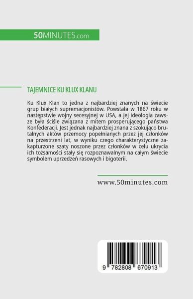Ku Klux Klan to jedna z najbardziej znanych na ¿wiecie grup biäych supremacjonistów. Powstäa w 1867 roku w nast¿pstwie wojny secesyjnej w USA, a jej ideologia zawsze by¿a ¿ci¿le zwi¿zana z mitem prosperuj¿cego pästwa Konfederacji. Jest jednak najbardziej znana z szokuj¿co brutalnych aktów przemocy pope¿nianych przez jej cz¿onków na przestrzeni lat, w wyniku czego charakterystyczne zakapturzone szaty noszone przez cz¿onków w celu ukrycia ich to¿samo¿ci stäy si¿ rozpoznawalnym na cäym ¿wiecie symbolem uprzedze¿ rasowych i bigoterii. Ta prosta i pouczaj¿ca ksi¿¿ka zawiera dok¿adne omówienie kluczowych momentów w historii Ku Klux Klanu, w tym ponownego zäo¿enia organizacji przez Williama J. Simmonsa w 1915 roku, wynikaj¿cej z tego wewn¿trznej walki o w¿adz¿ i skandali prawnych, które ostatecznie doprowadzi¿y do jej upadku. Zawiera równie¿ przegl¿d kluczowych cz¿onków KKK w trakcie jego historii, wprowadzenie do jego wewn¿trznej struktury i omówienie g¿ównych star¿ organizacji z prawem, daj¿c ci wszystkie istotne informacje na temat tej notorycznej grupy nienawi¿ci.