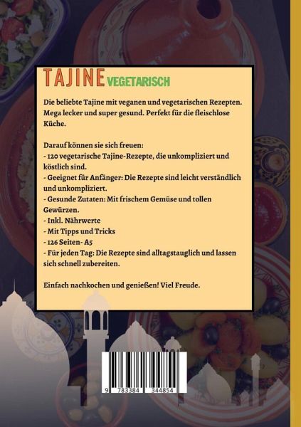 Buchbeschreibung: 120 vegetarische Tajine-RezepteDie beliebte Tajine mit veganen und vegetarischen Rezepten. Mega lecker und super gesund. Perfekt für die fleischlose Küche.Darauf können sie sich freuen:- 120 vegetarische Tajine-Rezepte, die unkompliziert und köstlich sind.- Geeignet für Anfänger: Die Rezepte sind leicht verständlich und unkompliziert.- Gesunde Zutaten: Mit frischem Gemüse und tollen Gewürzen.- Inkl. Nährwerte - Mit Tipps und Tricks - 126 Seiten- A5- Für jeden Tag: Die Rezepte sind alltagstauglich und lassen sich schnell zubereiten. Einfach nachkochen und genießen! Viel Freude.