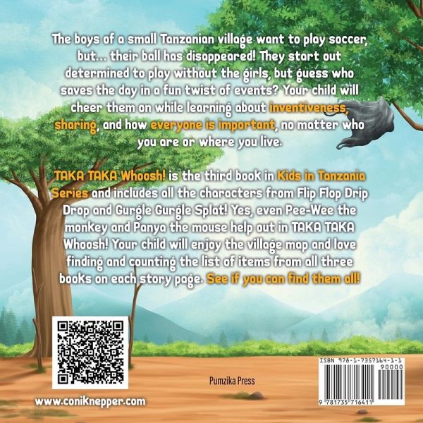 A group of children in Tanzania, East Africa learn to share and play soccer together. When they can't find a ball the girls save the day! Pee-Wee the monkey shares how to play "Seek, Find and Count" throughout the story. Children love finding objects and following the village map.